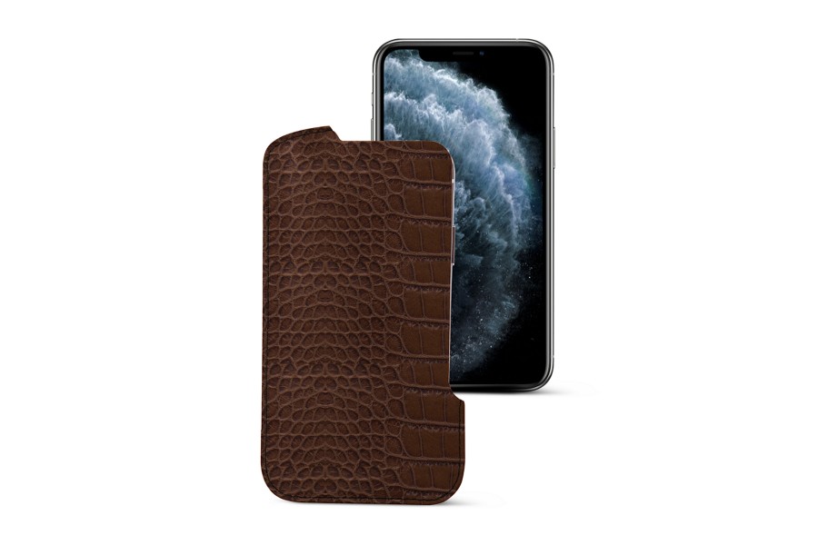 Capa para iPhone 11 Pro Max - Castanho Escuro - Couro de Bezerro - Estilo Crocodilo