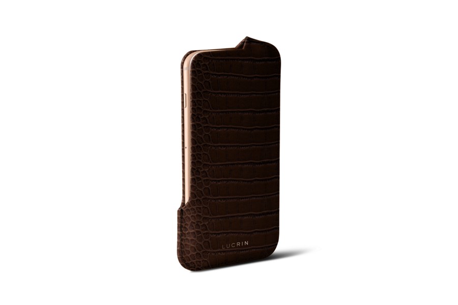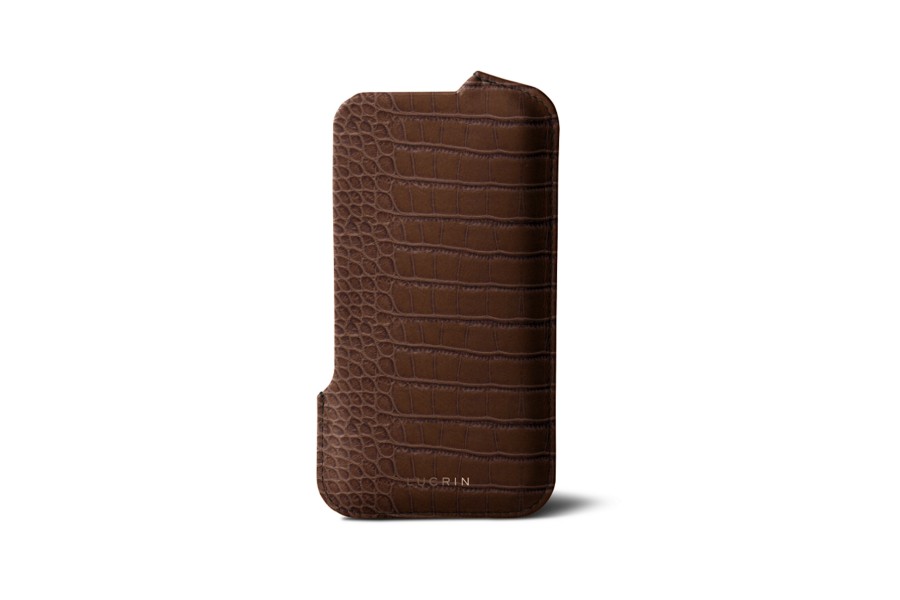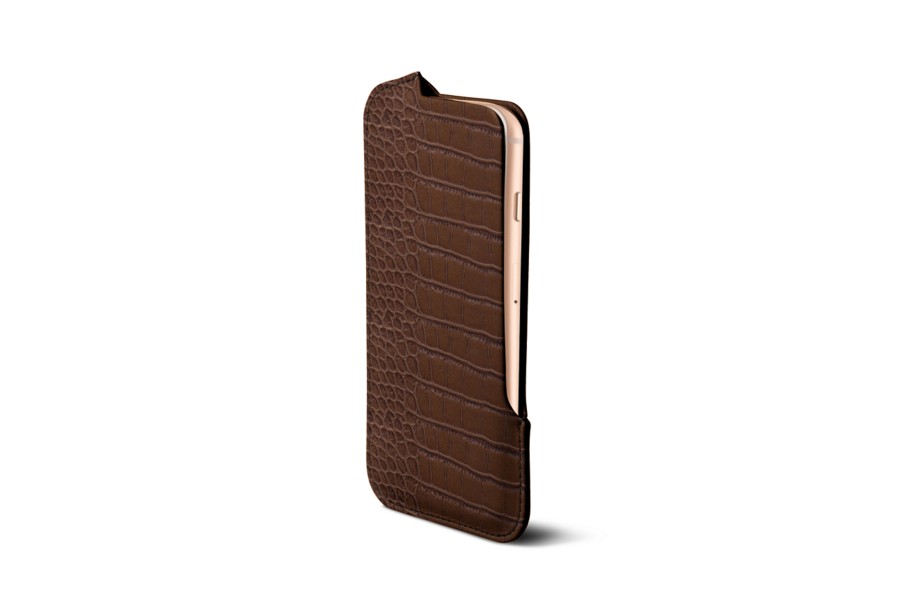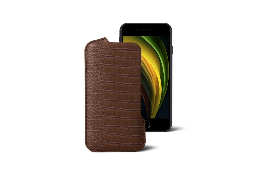 Capa com Abertura para iPhone SE - Castanho Escuro - Couro de Bezerro - Estilo Crocodilo