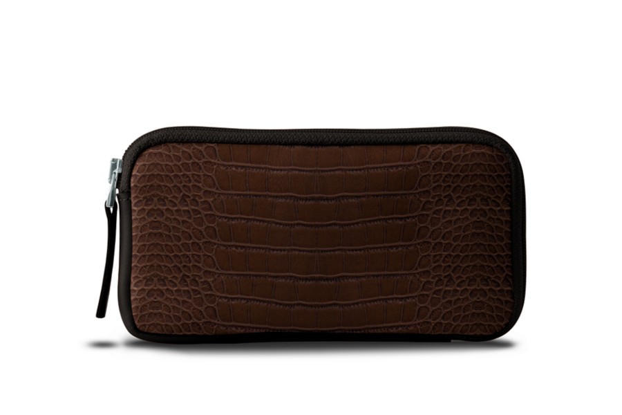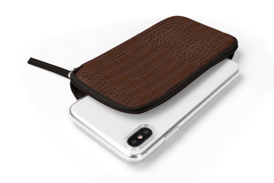 Carteira com fecho para iPhone XS - Castanho Escuro - Couro de Bezerro - Estilo Crocodilo