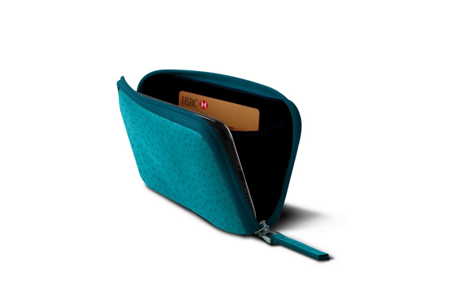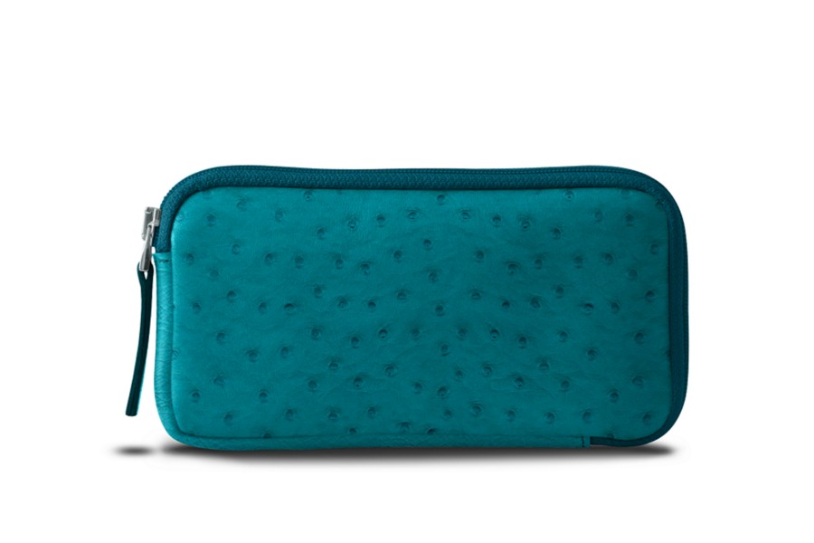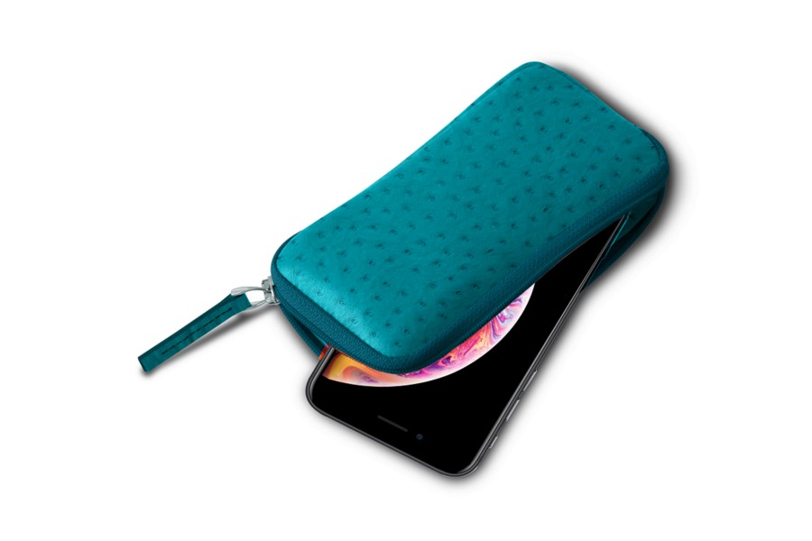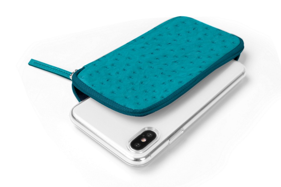 Carteira com fecho para iPhone XS - Turquesa - Couro Real de Avestruz