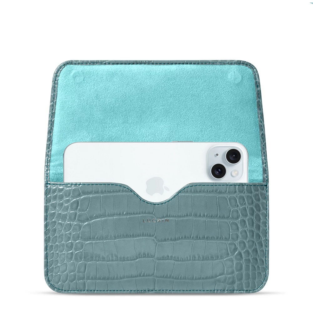 Capa de cinto para iPhone 15 Turquesa  - Couro de Bezerro - Estilo Crocodilo
