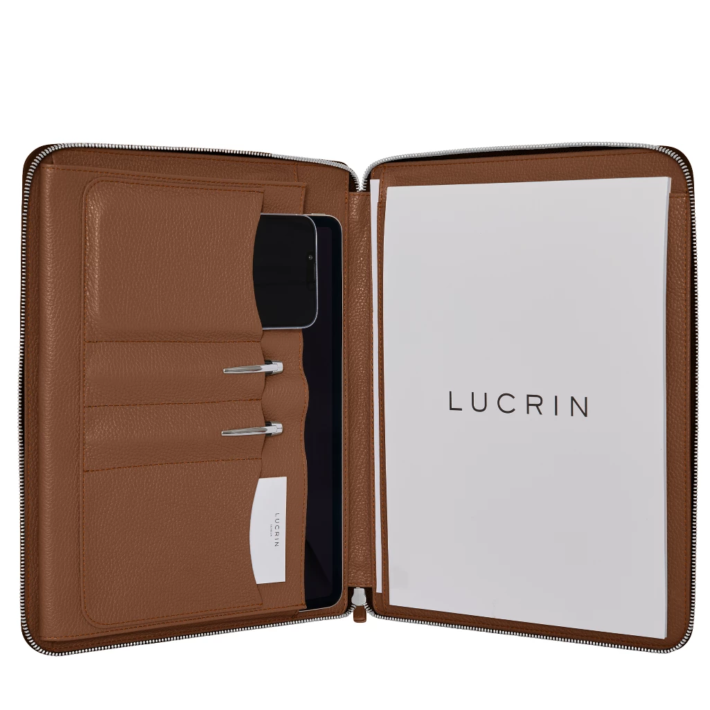 Esta é a versão de luxo entre os vários portfólios A4 que propomos. Criada especialmente para L5 Designer Collection com couro autêntico premium, esta sublime pasta possui recursos fantásticos, ideais para manter os seus documentos seguros e organizados. Este portfólio A4 possui um fecho muito confiável, que protege tudo o que está no interior - excelente quando está em movimento. O interior desta pasta foi projetado com espaços e bolsos bem pensados para iPad, telemóvel, auscultadores, canetas, bloco de notas A4 e outros documentos.
