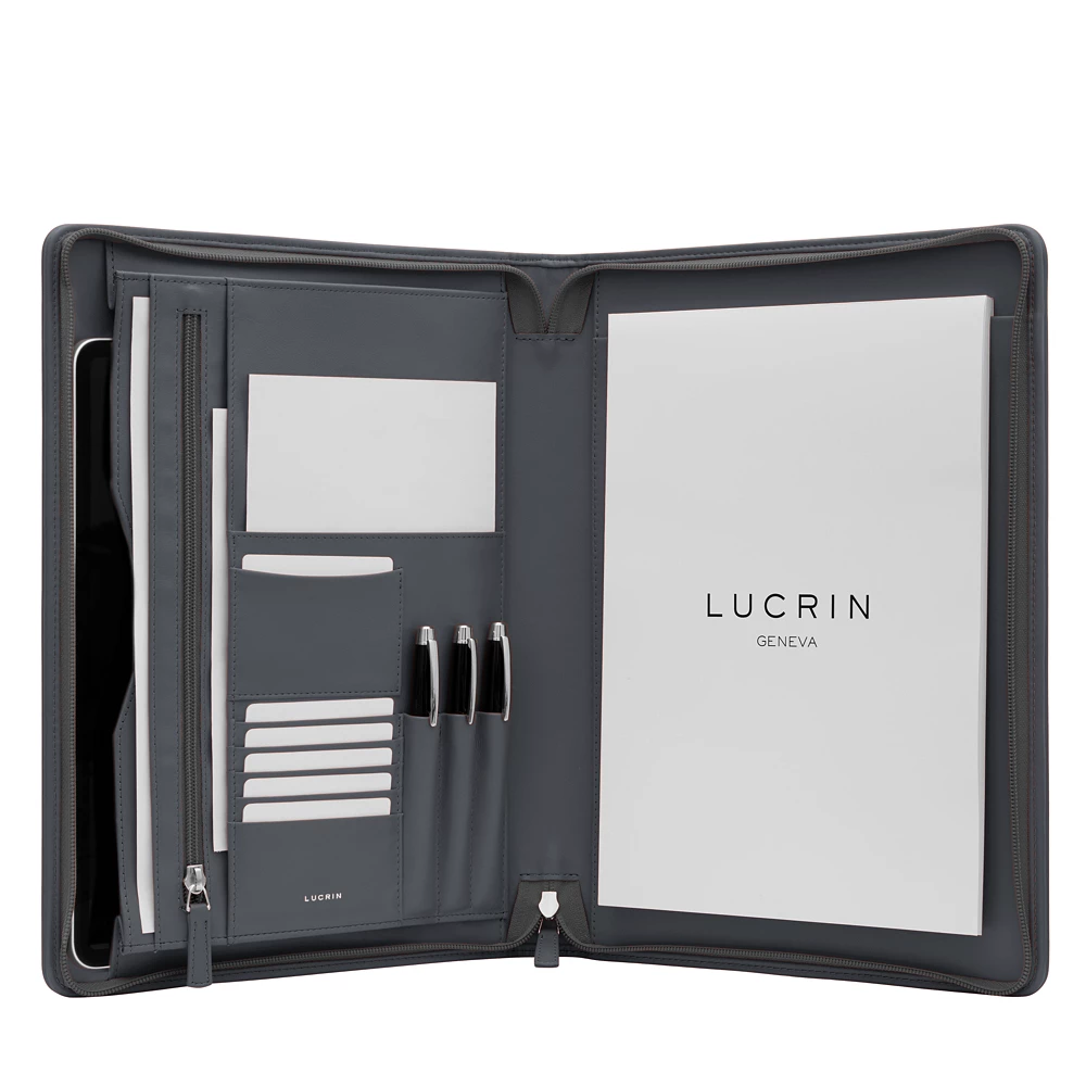 Esta capa para documentos A4 bem equipada irá fazer parte de todas as etapas da sua carreira. À direita, há espaço para um bloco de notas A4. À esquerda: 3 suportes para canetas, 5 espaços para cartões de crédito e 1 bolso para cartões de negócio/visita. Um bolso aberto (para um MacBook Pro 13 ou similar) e outro com fecho de correr vão satisfazer todas as suas necessidades profissionais. Não é preciso mencionar que o artesanato em couro de alta qualidade não deixará de surpreender os apreciadores com a magnifica sutileza do trabalho. É o companheiro ideal para as suas viagens corporativas.