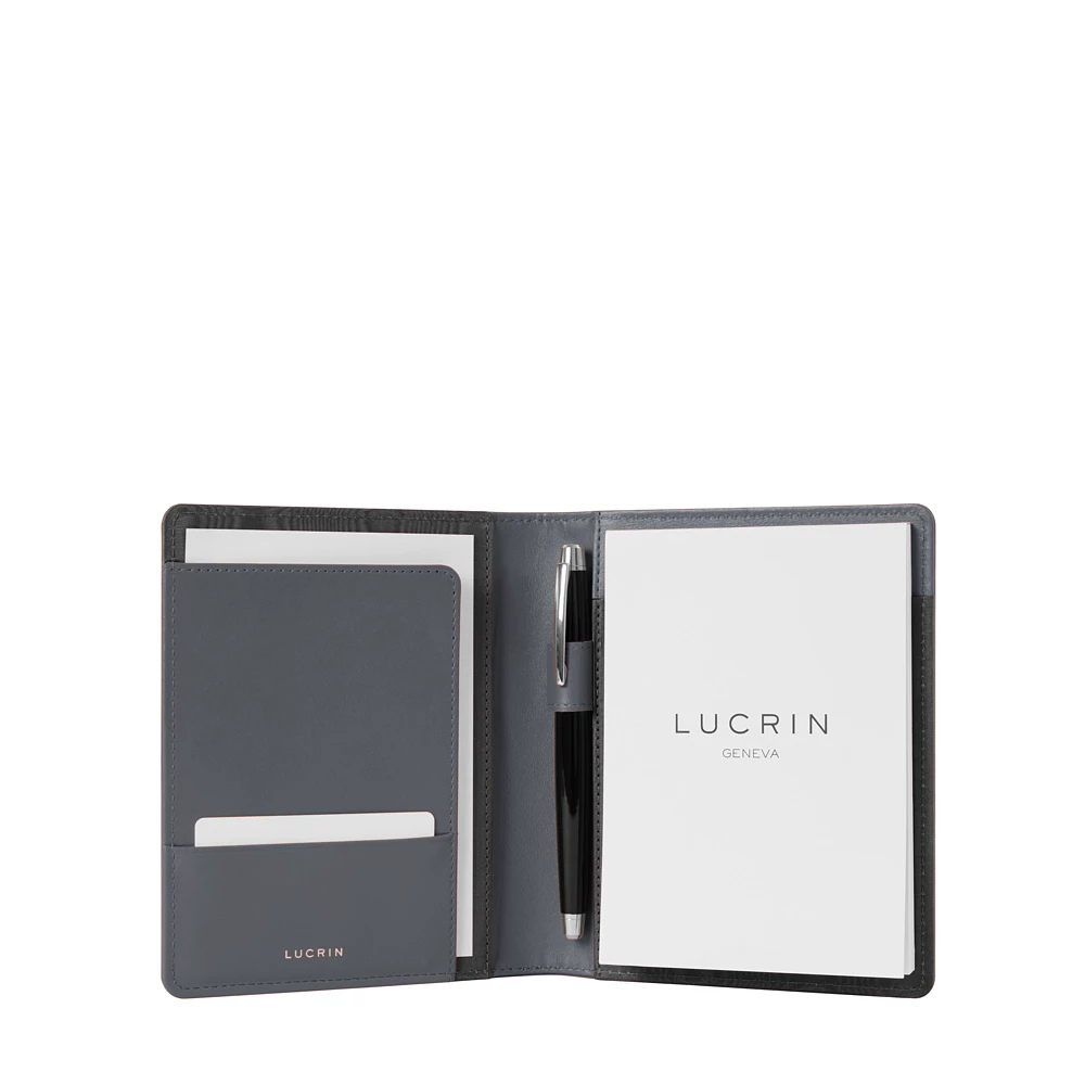 Este acessório de escritório é muito popular entre os profissionais: um portfólio A6 multifunções. Equipado com um bolso e um espaço para cartões de visita à esquerda e com o bloco de notas A6 à direita, este portfólio em couro de alta qualidade também possui um suporte ao meio para segurar a sua caneta favorita. Este produto mantém tudo o que precisa para as reuniões e viagens de negócios sempre à mão. Recargas para o bloco de notas A6 estão disponíveis para compra no nosso site.